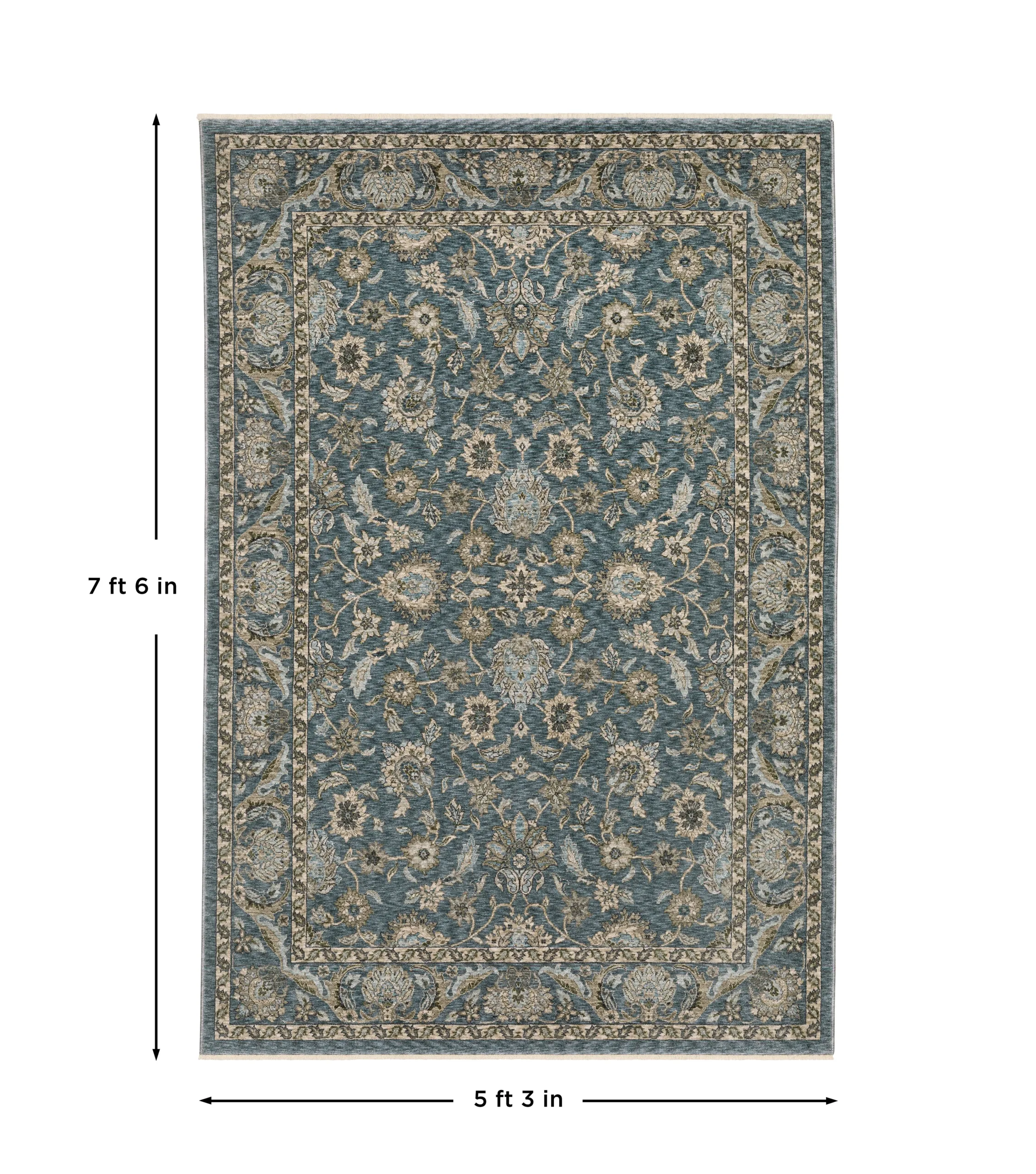 Alfombra de interior tejida a máquina, elaborada en fibra de poliéster, con un diseño clásico de estilo oriental. Su patrón elegante la convierte en una pieza ideal para dar calidez y distinción.