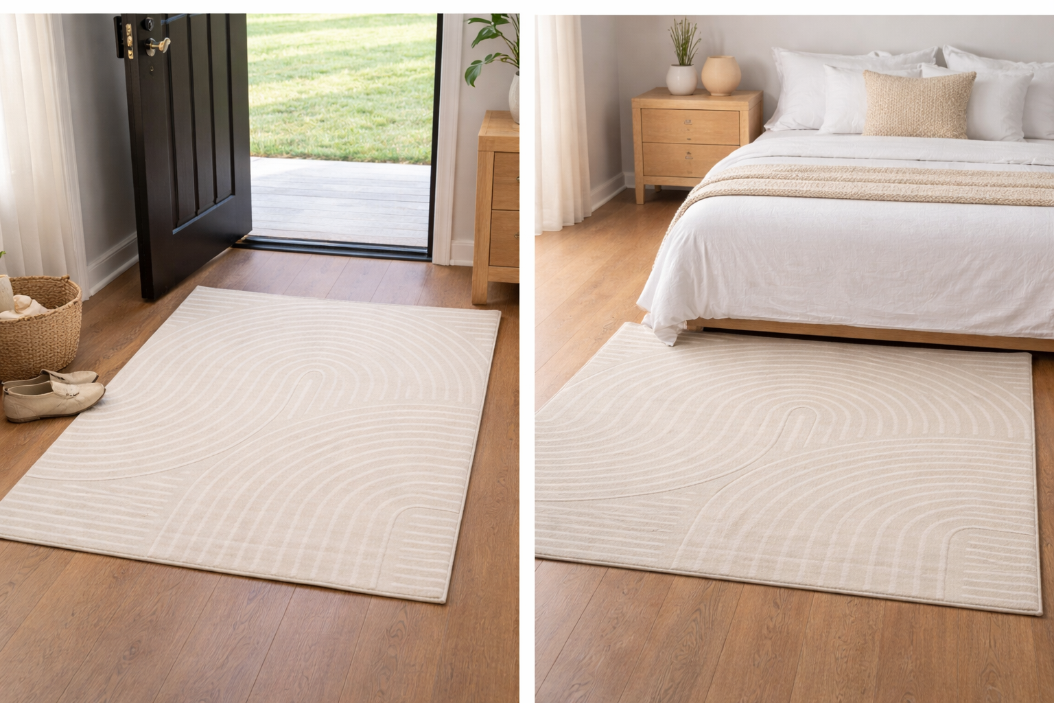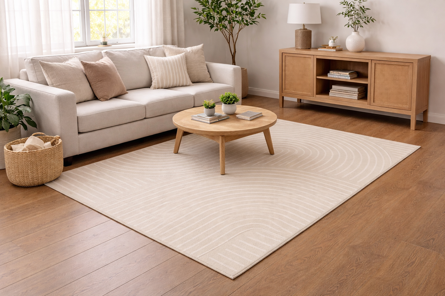 Alfombra de la Colección City I, se distingue por su diseño moderno y minimalista, compuesto por delicadas líneas curvas en relieve que aportan profundidad.