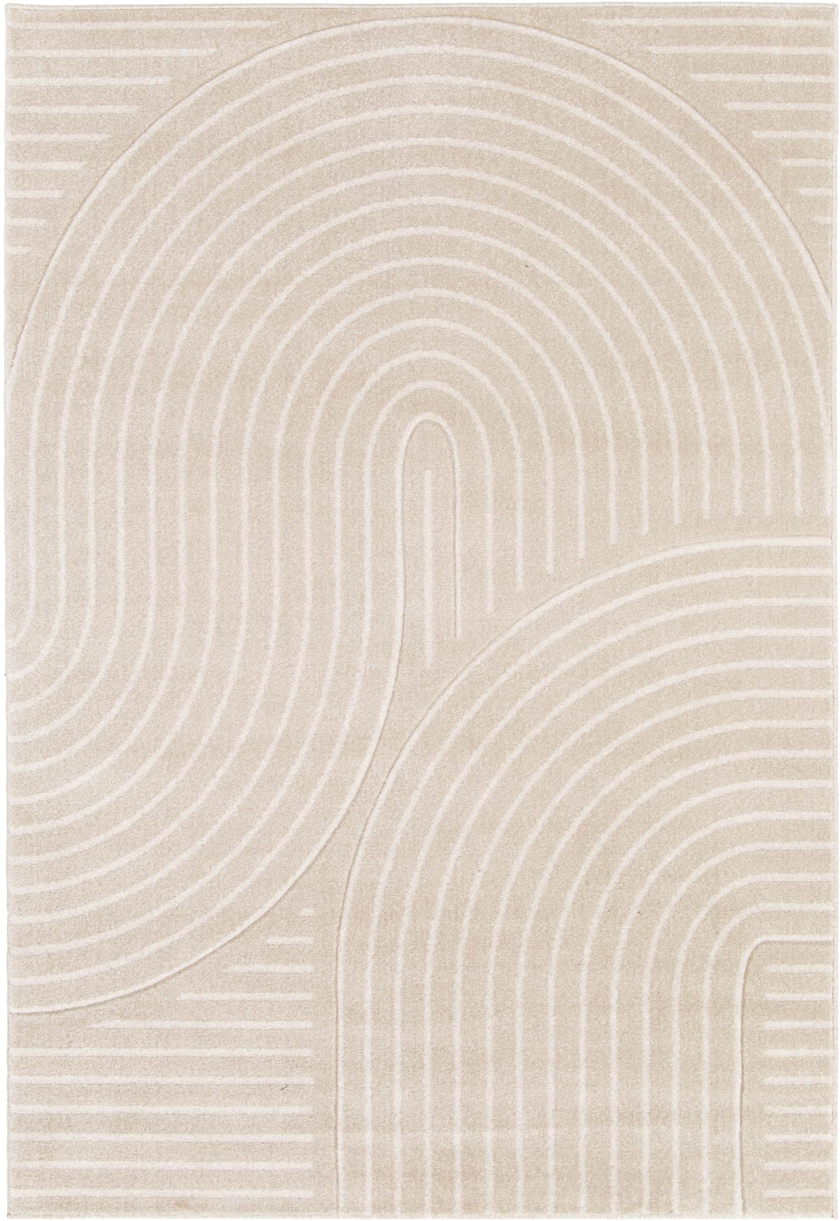 Fibra 100% polipropileno, tejida a máquina, ofrece una excelente resistencia al uso diario manteniendo la definición de su diseño y su apariencia original por más tiempo. Cuenta con acabado overlock en sus cuatro lados y bordes tallados. Su diseño se aleja de los patrones cromáticos complejos para centrarse en un juego de formas orgánicas y líneas concéntricas en un elegante tono beige crema.