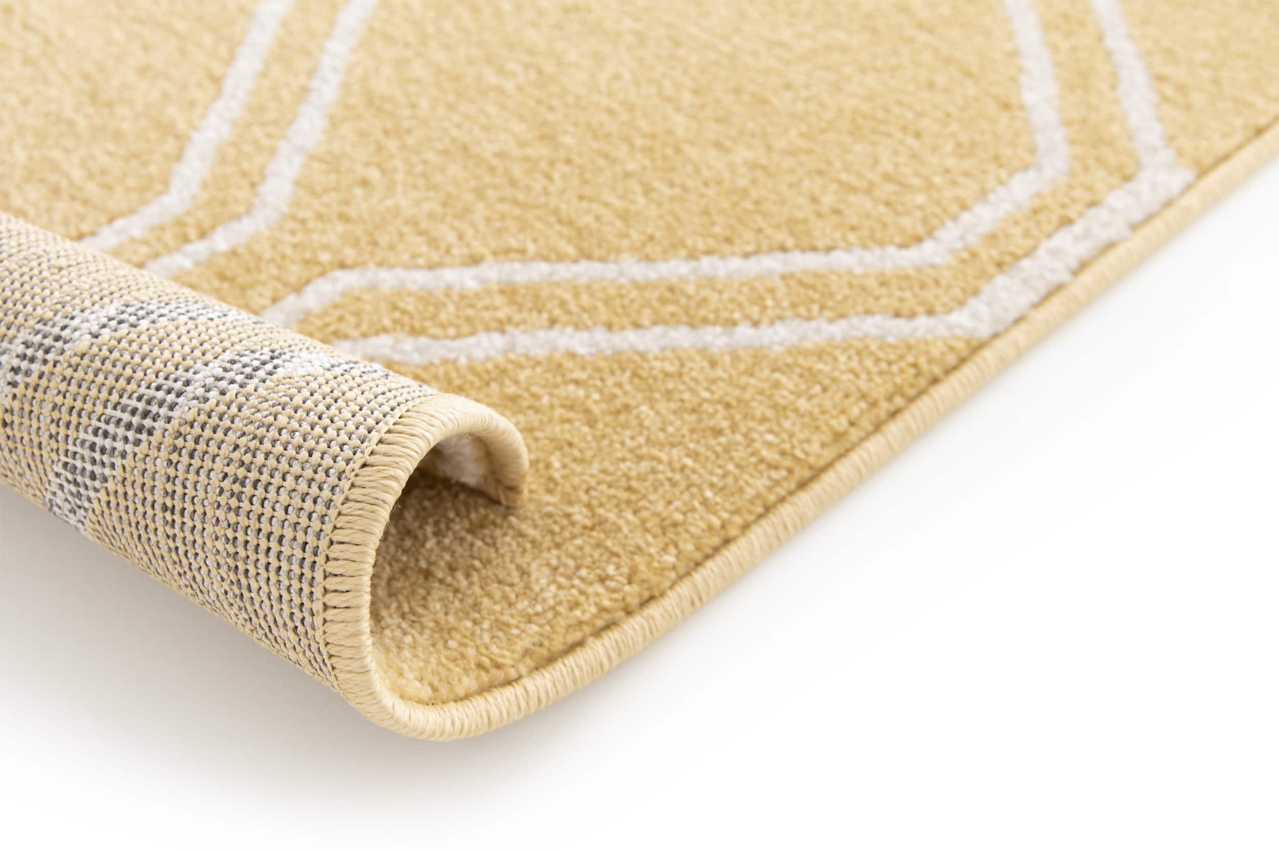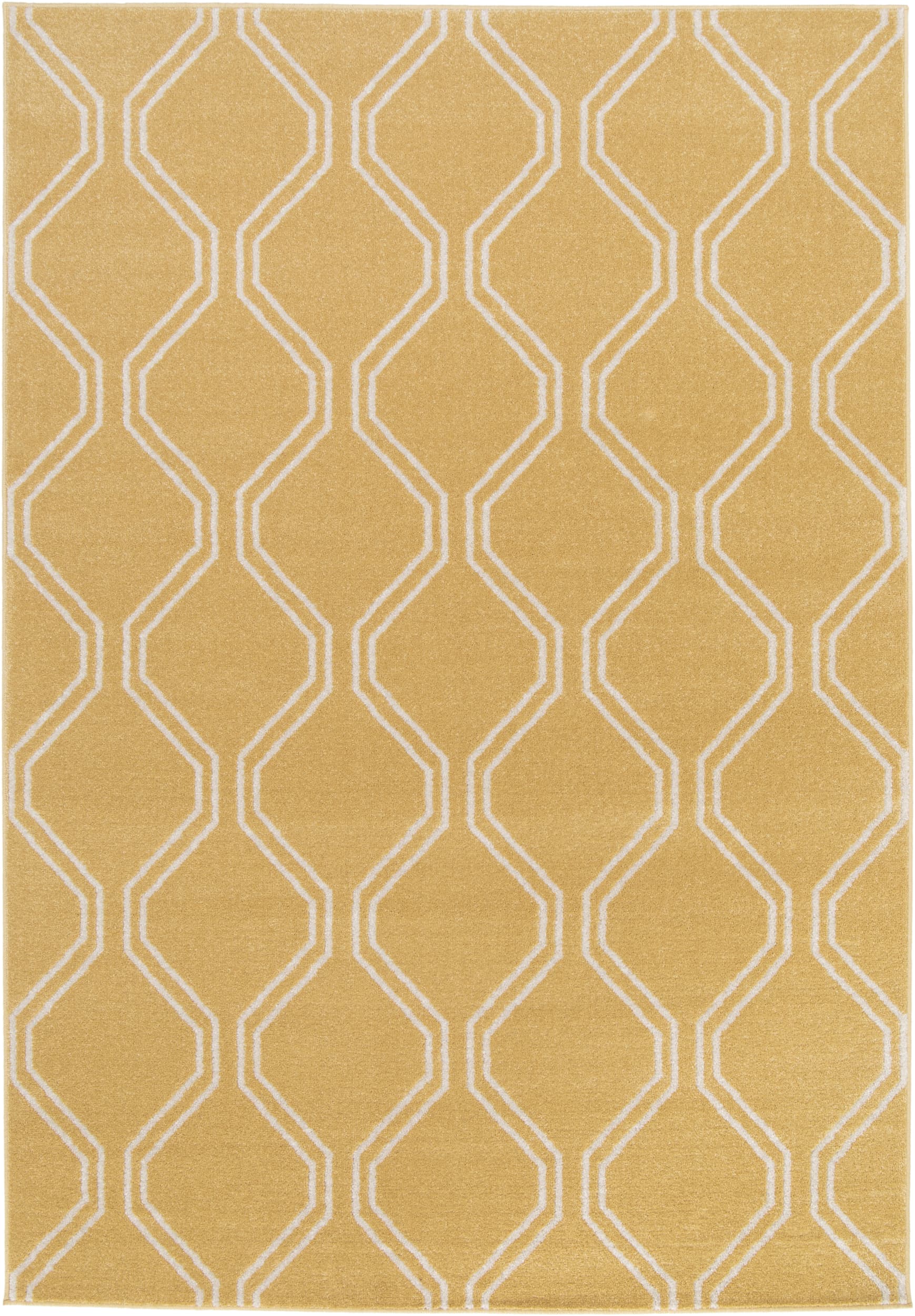 Tono mostaza con líneas estilizadas que enmarcan un patrón repetitivo geométrico blancas, aporta ritmo visual y sofisticación al espacio.