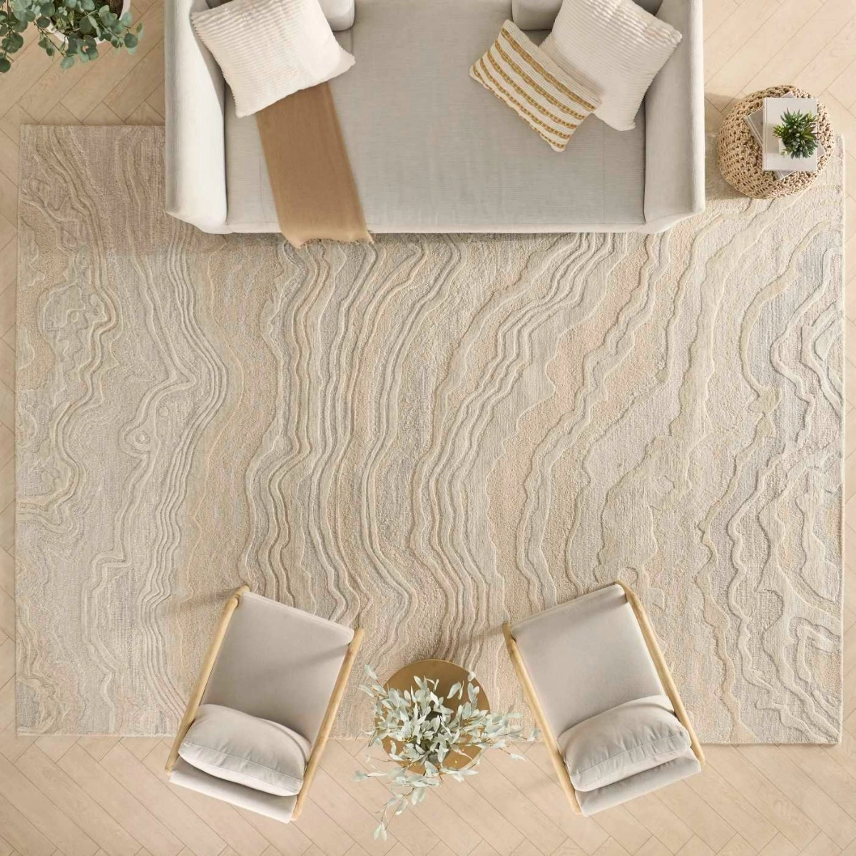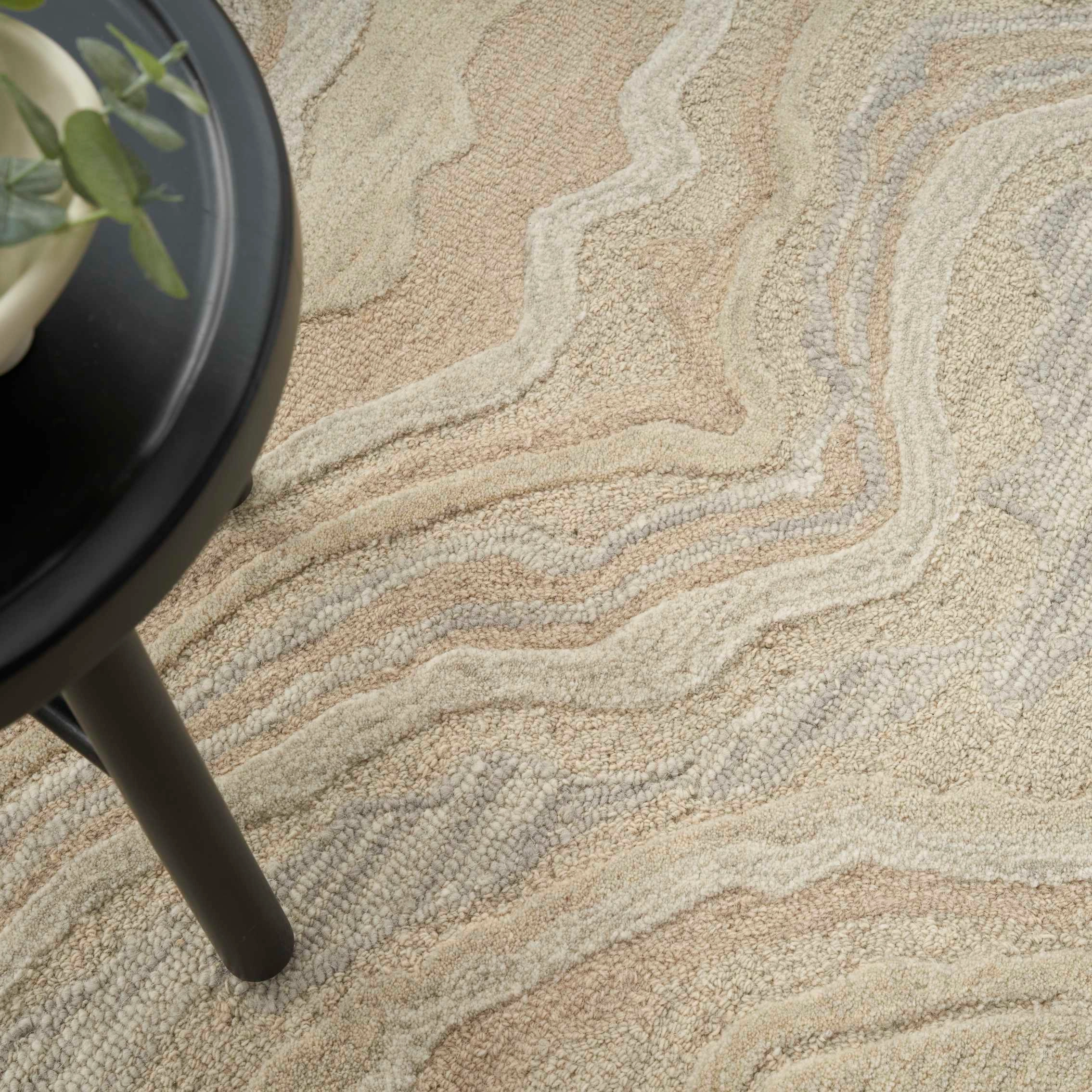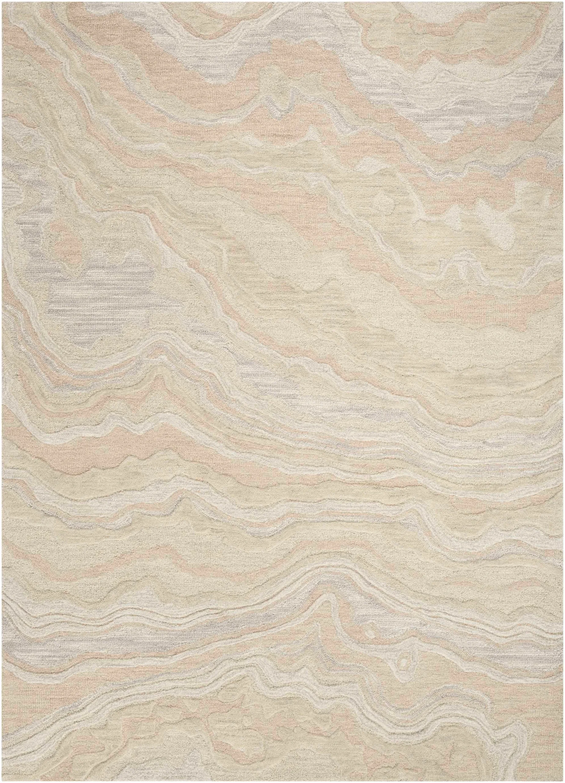Alfombra 100% lana para uso interior, con un delicado diseño ondulado en tonos neutros y pastel que evoca la suavidad de la naturaleza. Con una textura cálida y elegante.