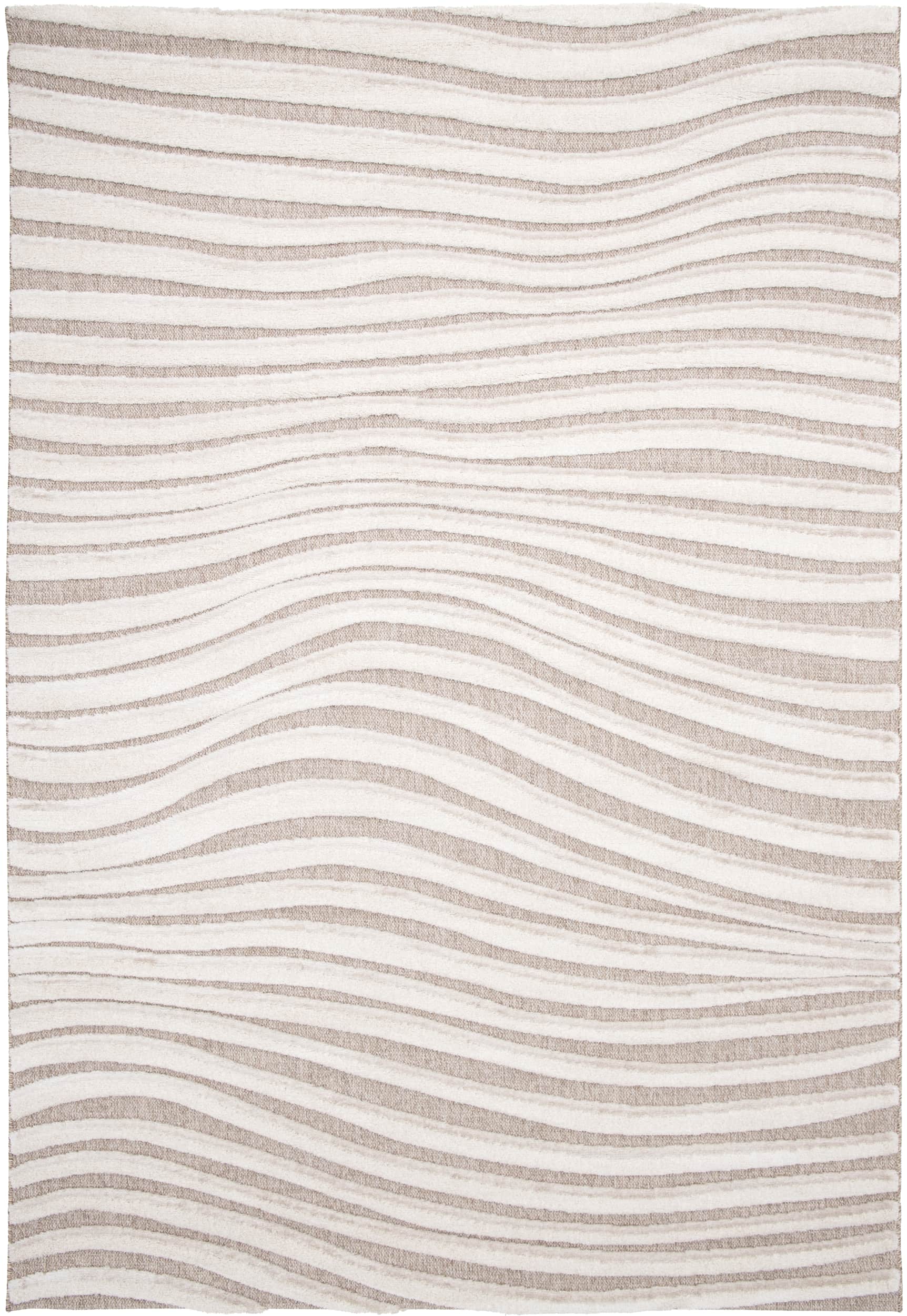 Alfombra tejida a máquina con un diseño moderno de líneas onduladas en tonos neutros, ideal para aportar calidez y estilo a cualquier espacio.