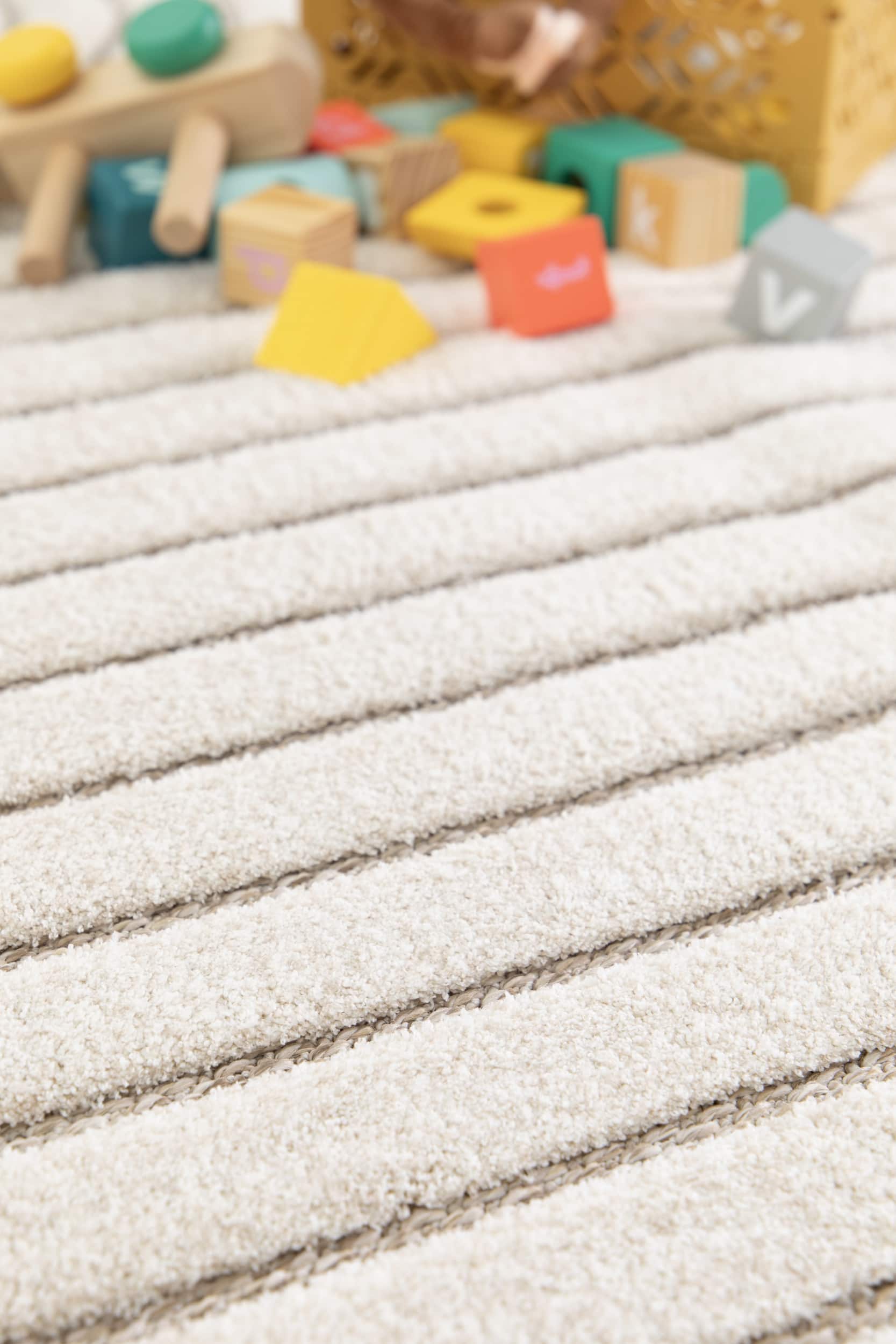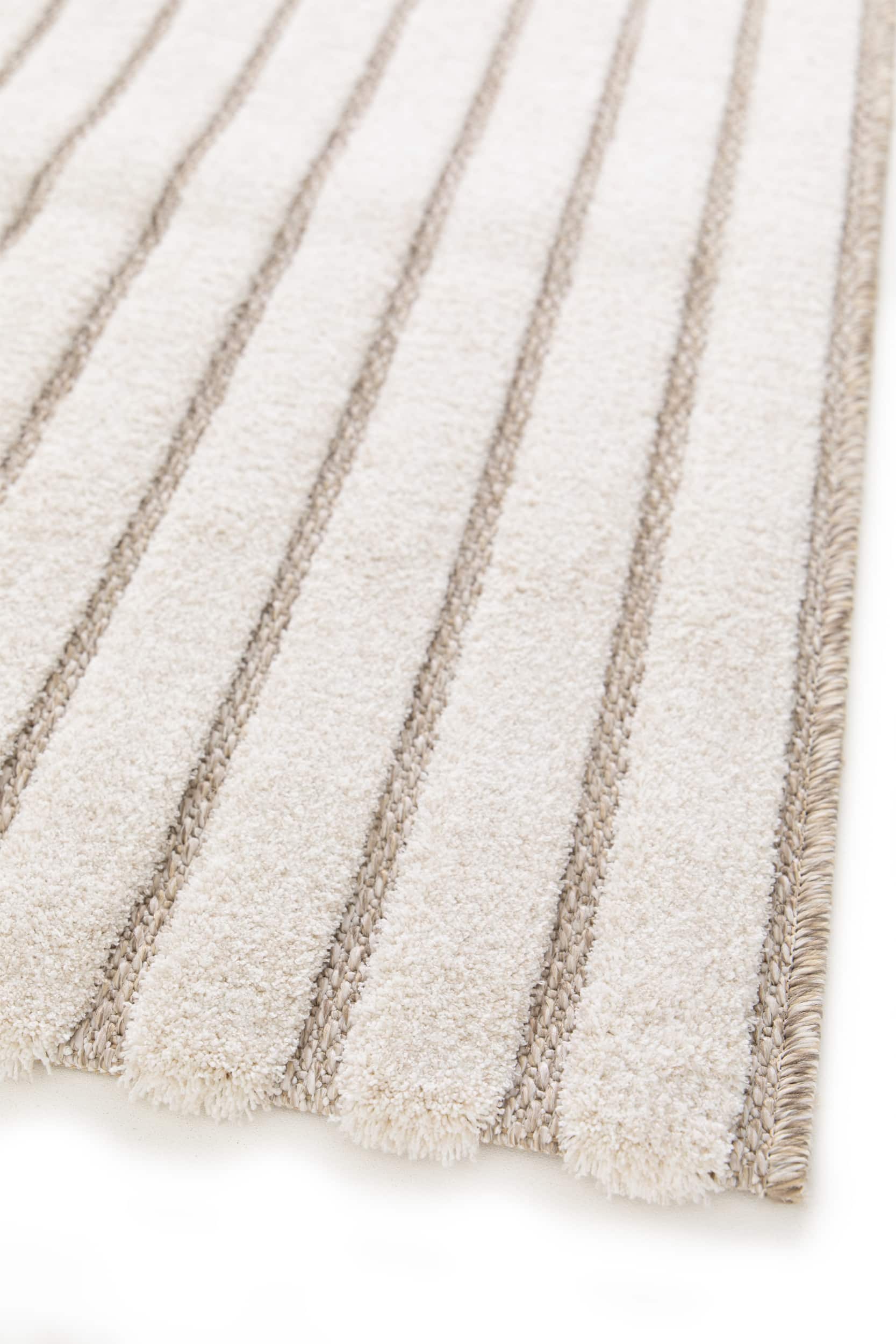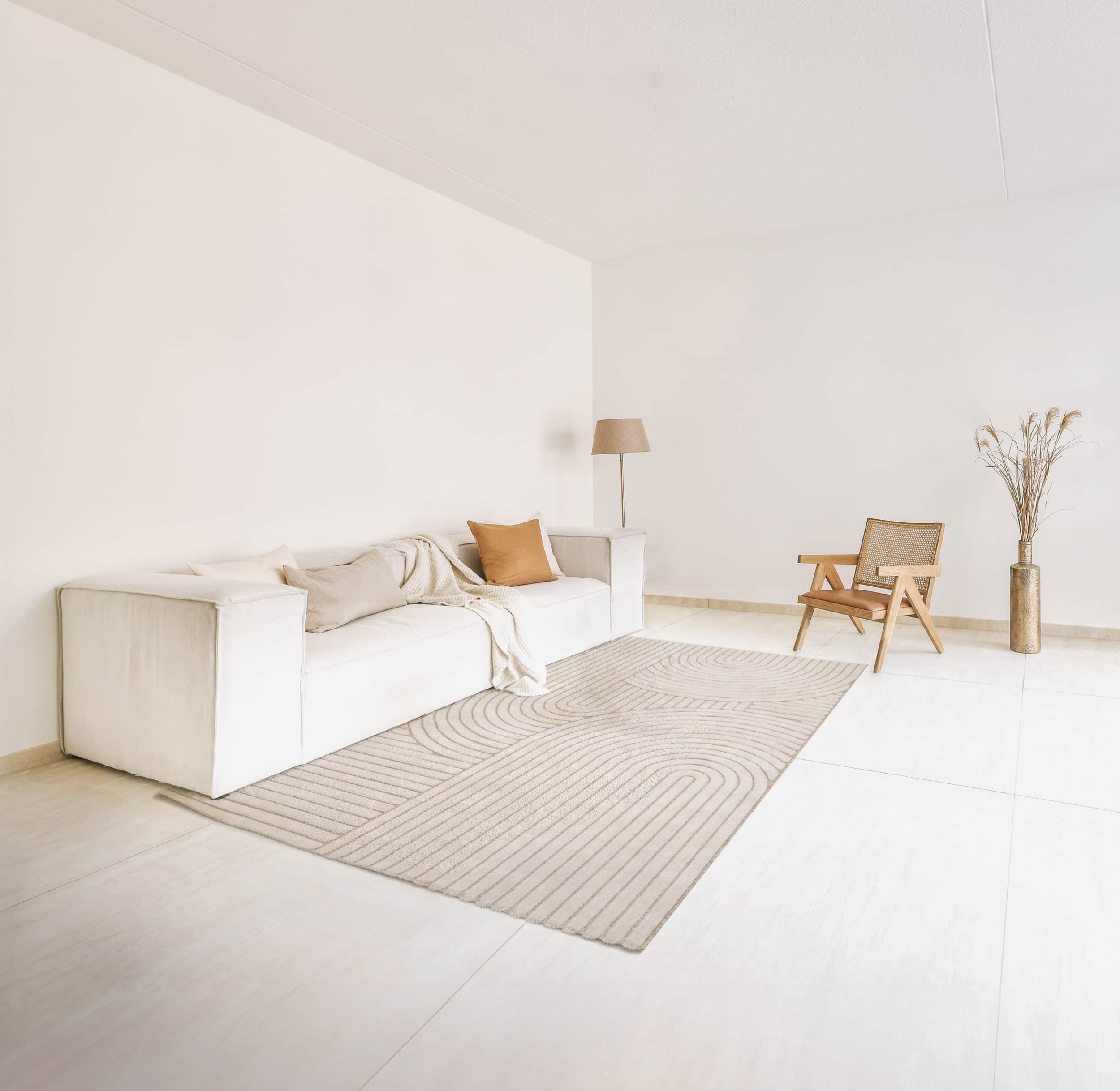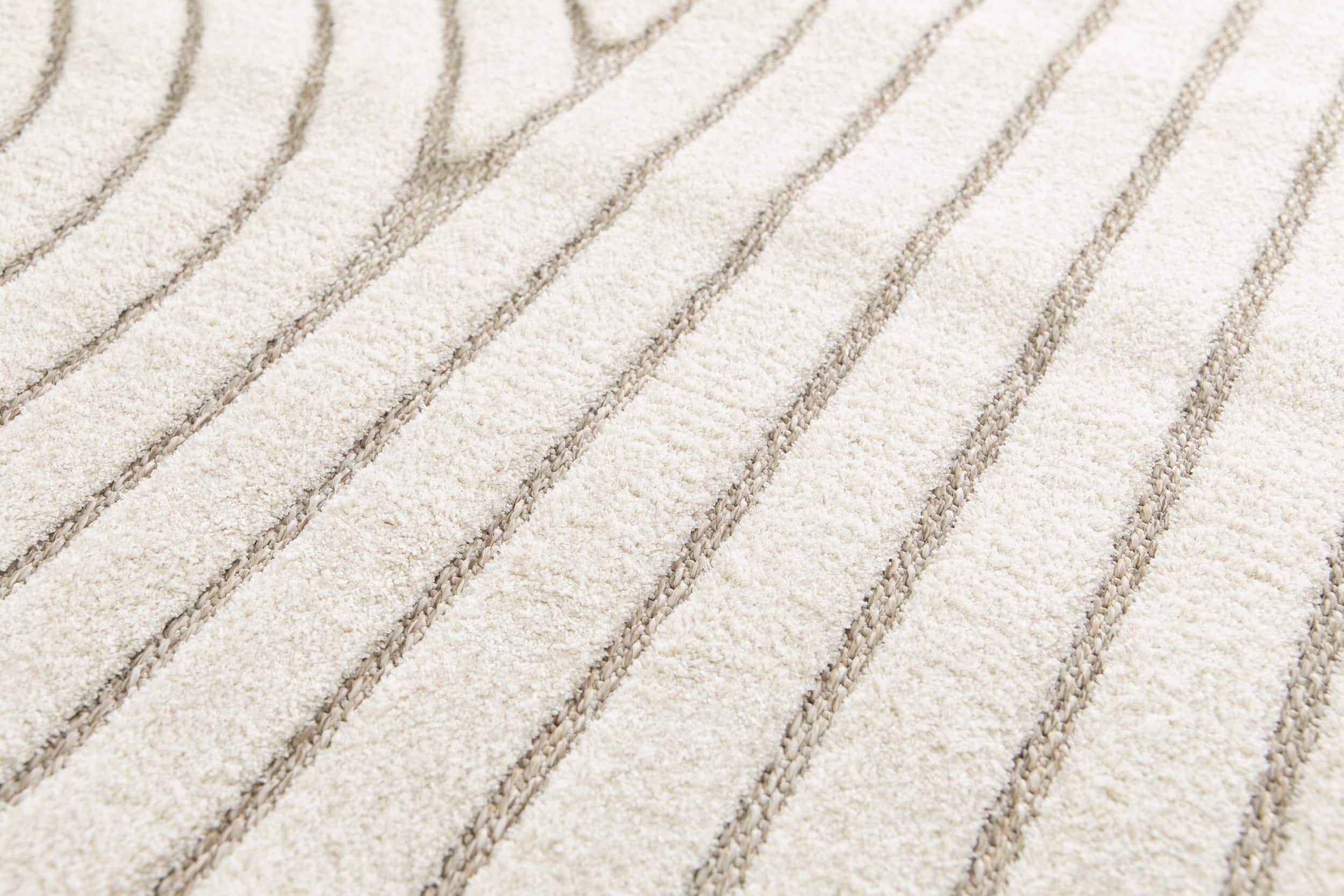 Alfombra tejida a máquina con un diseño moderno de líneas curvas y patrones geométricos en tonos neutros y de fibras que combina 40% polipropileno, 36% poliéster y 24% poliéster reciclado.