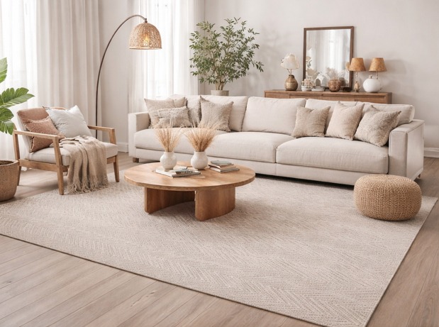 Alfombra de nuestra exclusiva Colección Montana, destaca por su sutil patrón geométrico en tonos neutros, diseñado para integrarse en ambientes contemporáneos. Fabricada en 100% polipropileno.