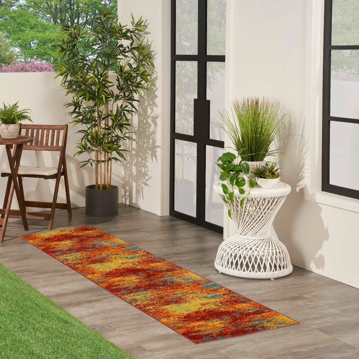 Exprese su pasión por la decoración creativa con esta artística alfombra de exterior de la colección Nourison Essentials. Una vibrante mezcla de colores primarios, inspirada en un atardecer dorado, revitaliza al instante un balcón, patio o jardín.