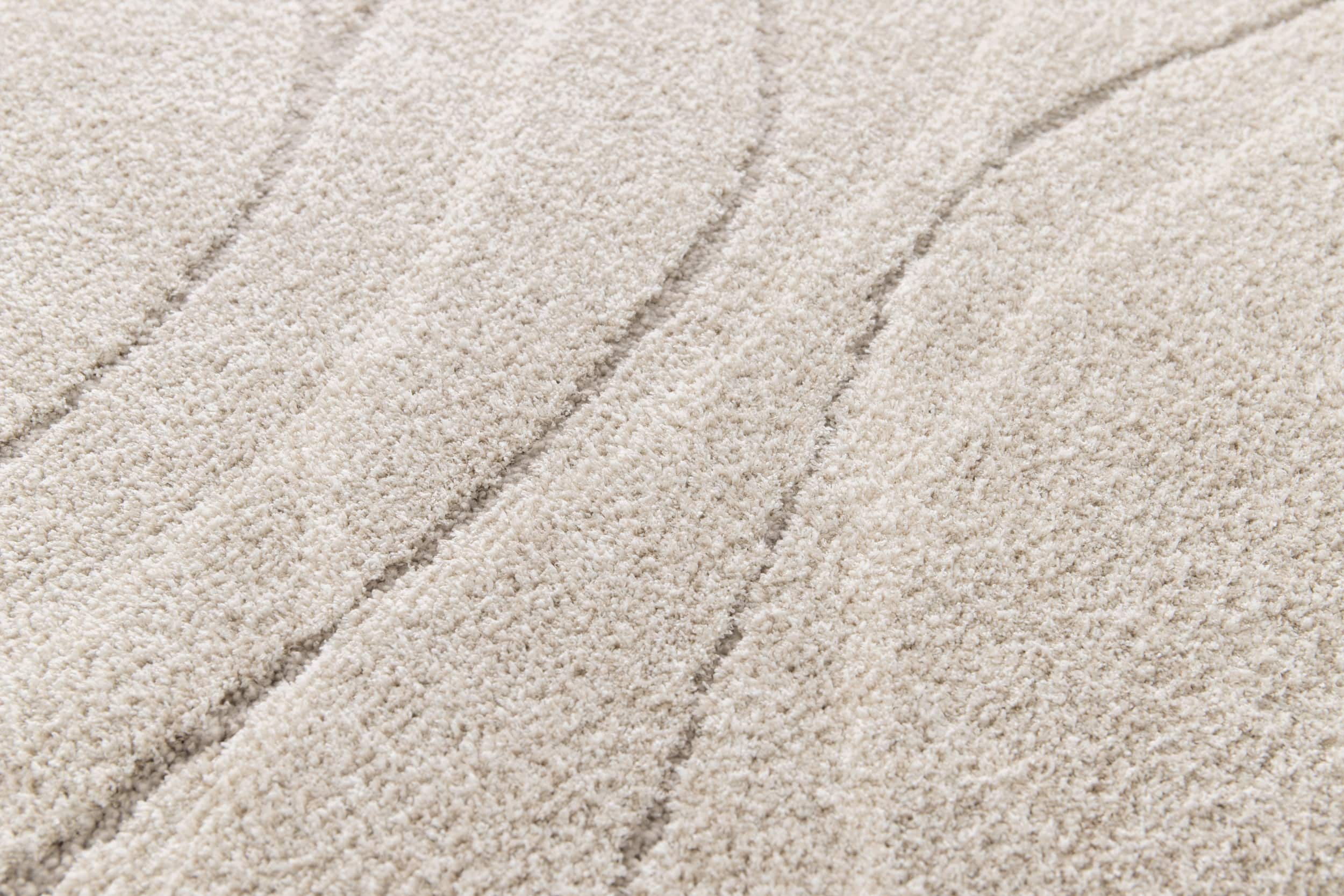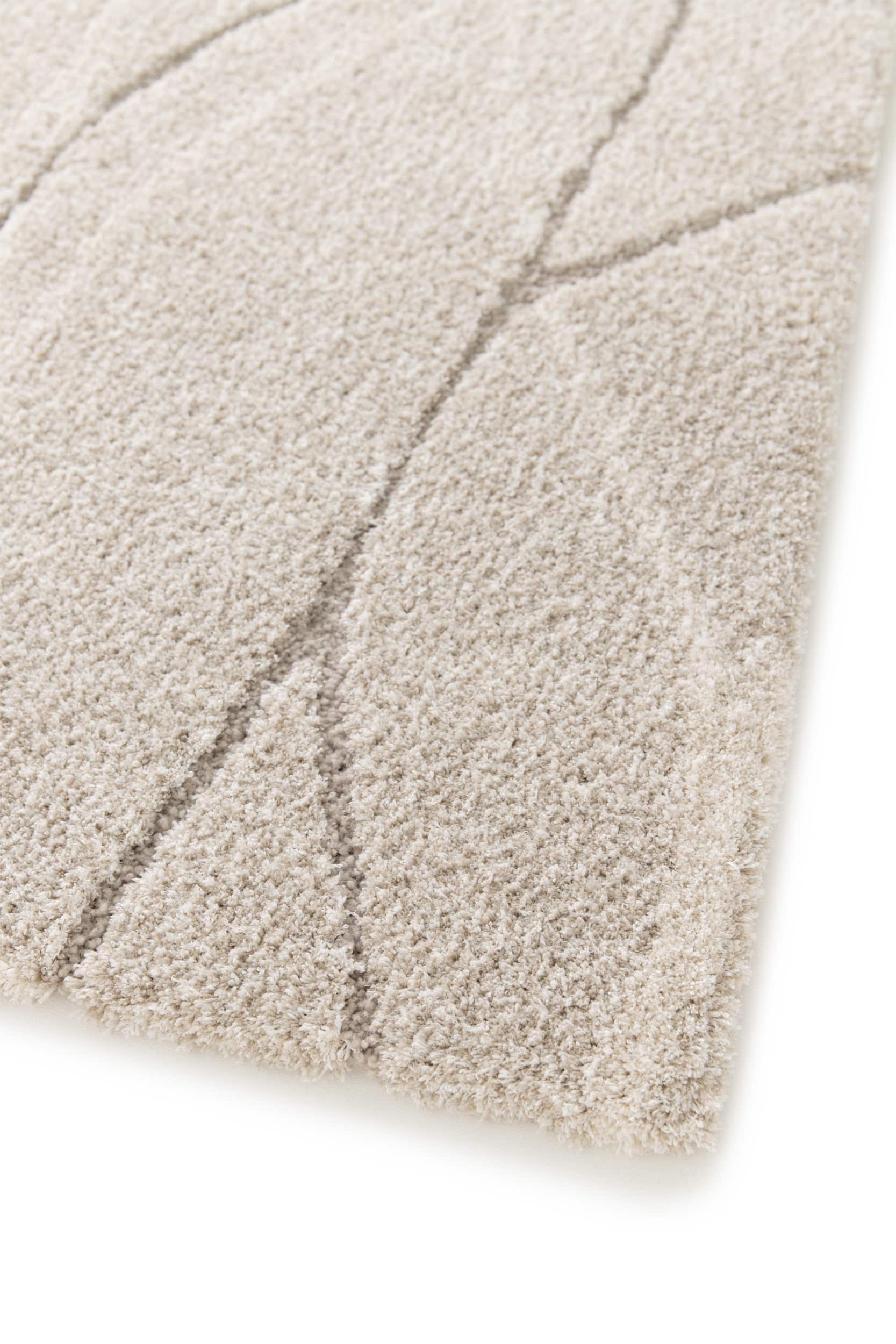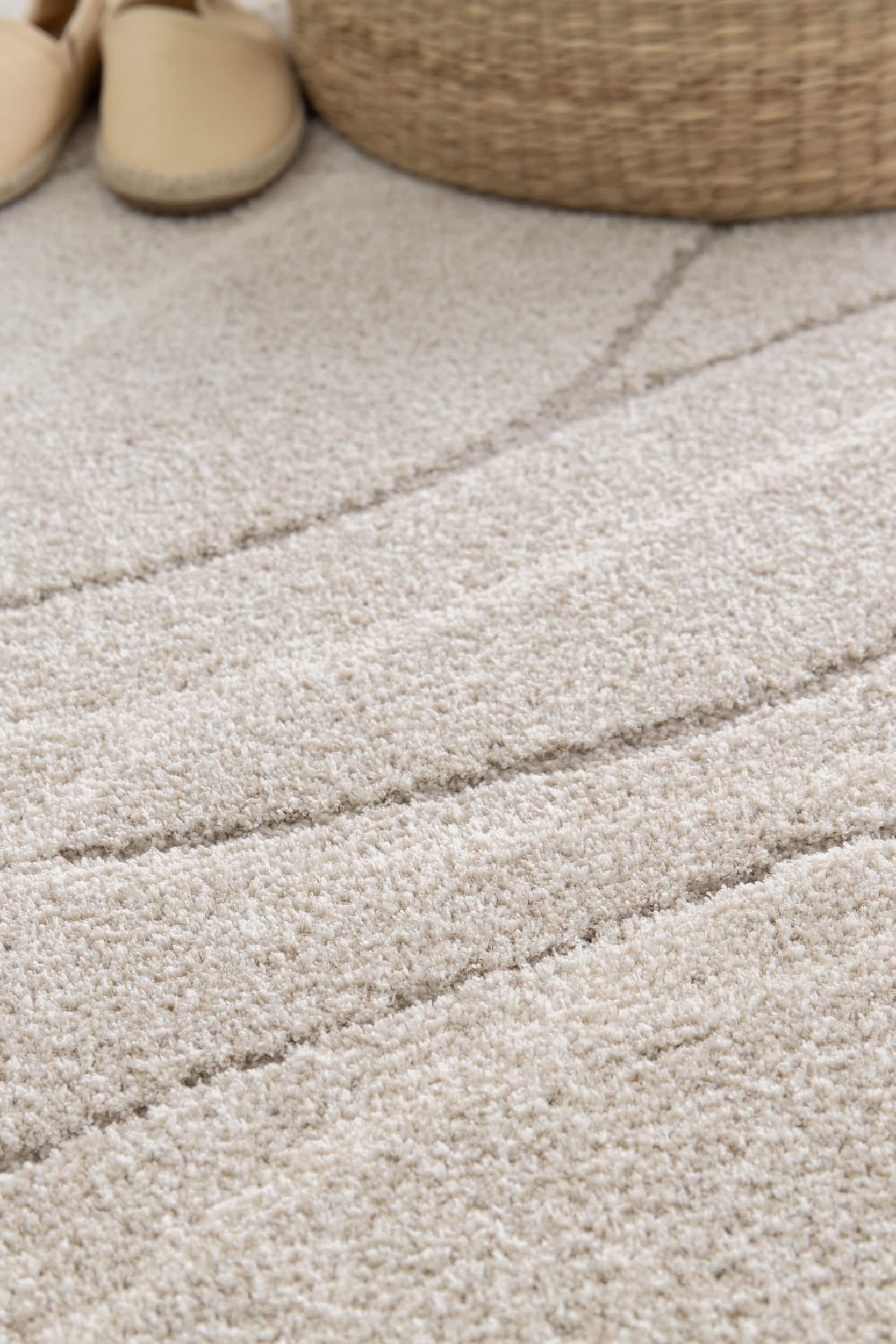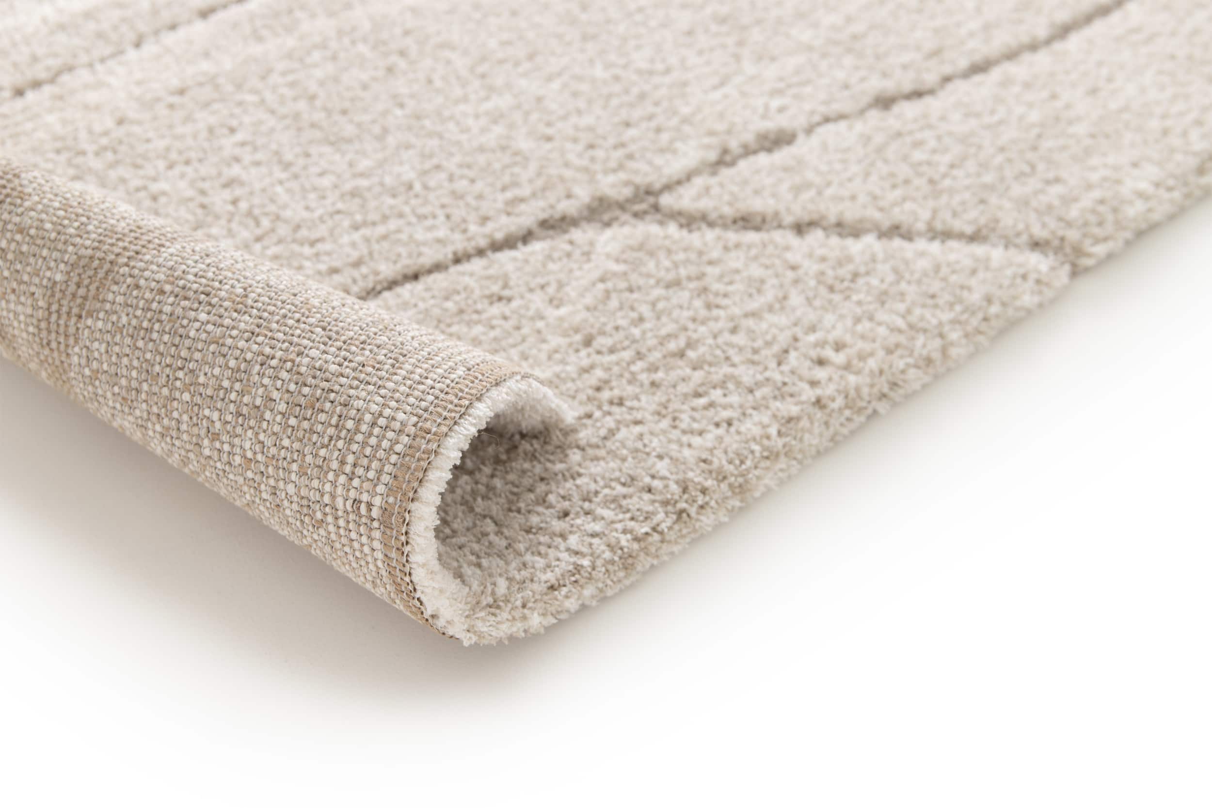 Fabricada en 100% poliéster y tejida a máquina, garantiza una textura suave, resistente y de acabado impecable. Su superficie de acabado peludo (que no requiere overlock) ofrece una sensación acogedora al caminar, mientras que la técnica alto-bajo realza el diseño con un atractivo relieve.
