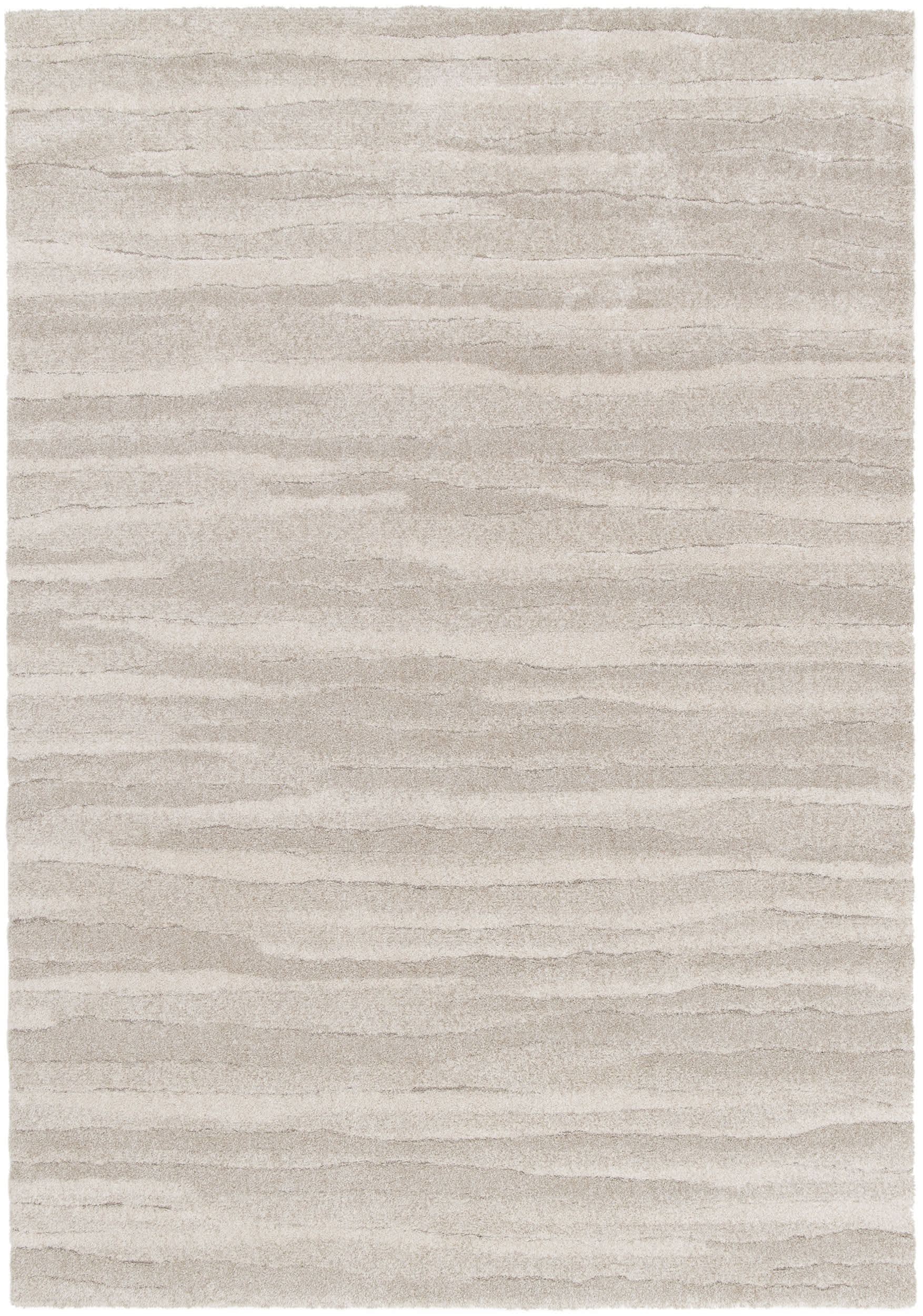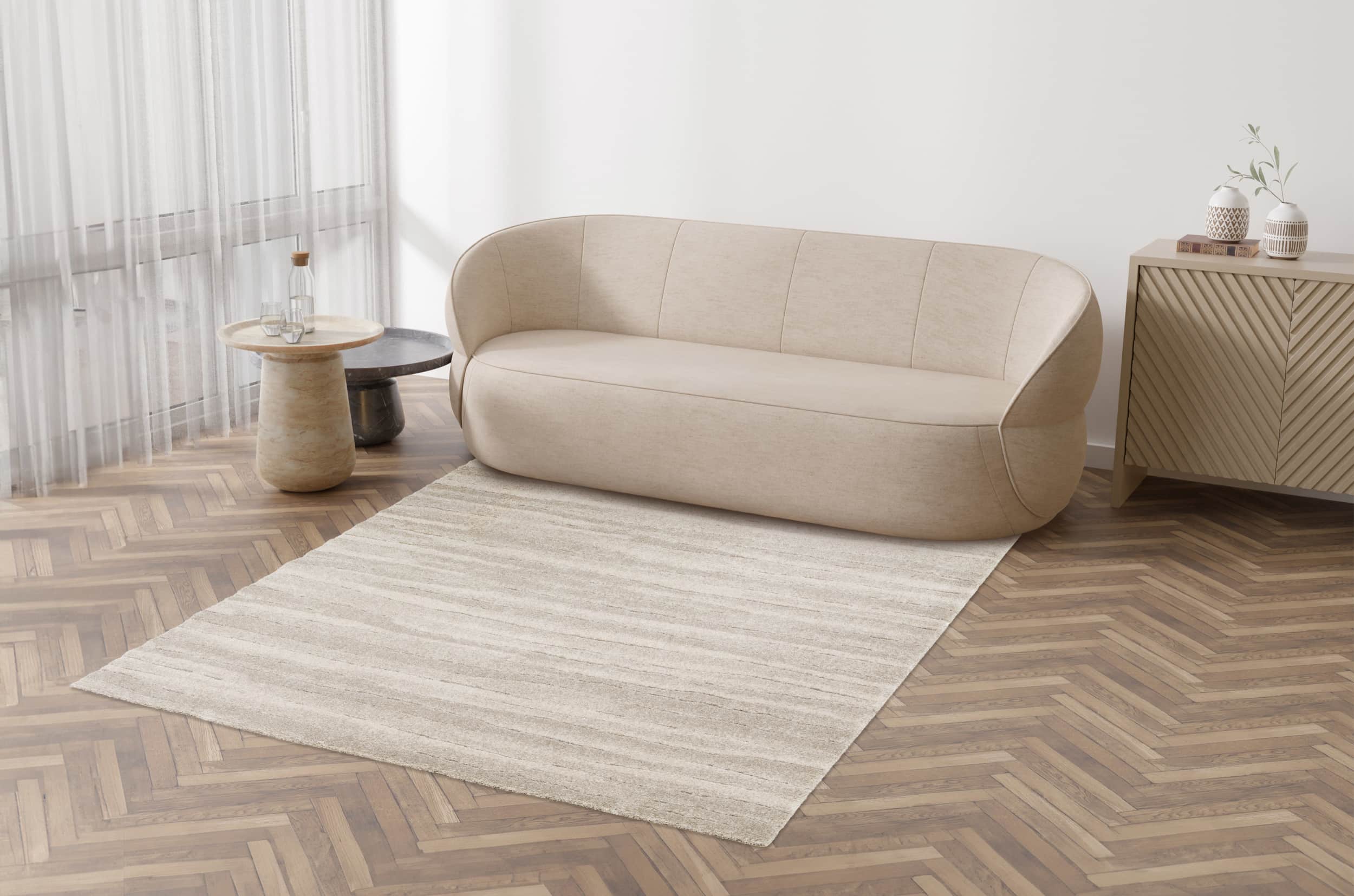 Alfombra de la Colección Sahara, destaca por su diseño sereno y contemporáneo, inspirado en suaves ondas que aportan movimiento y calidez visual al espacio.