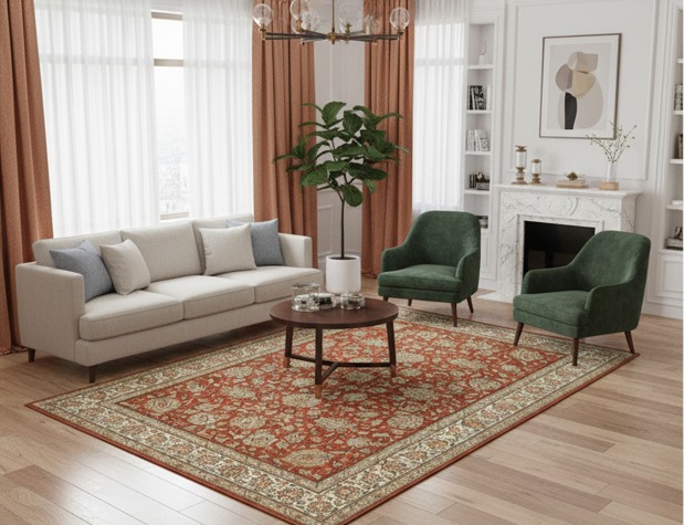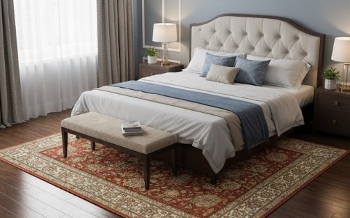 Tejido de pelo corto con una altura de 8,5 milímetros, ofreciendo una superficie densa y cómoda con un peso total de 2,40 kg/m². Presenta un acabado técnico superior con lados cortos doblados y pegados, y lados largos overlockeados, garantizando una estructura robusta y un borde definido.