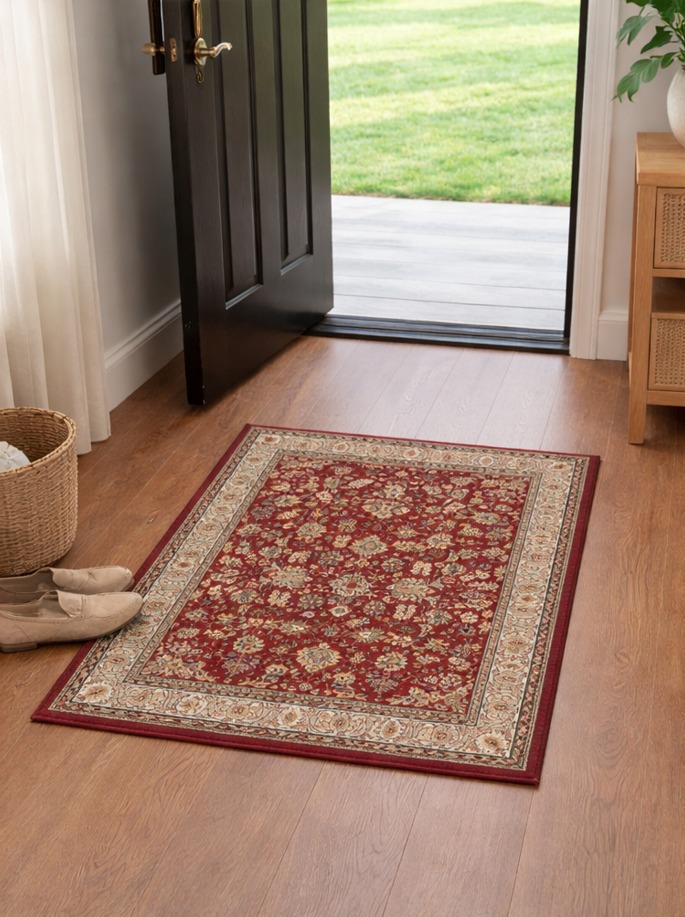 Alfombra con diseño clásico de inspiración oriental, con elaborados detalles florales y un marco decorativo. Fabricada en fibra 100% polipropileno y tejida a máquina.