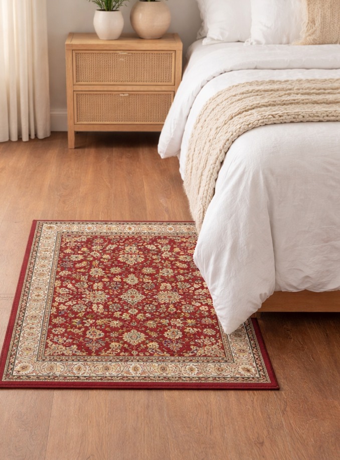 Combinación de tonos rojos profundos con acentos beige y dorados crea una apariencia elegante y atemporal, ideal para ambientes residenciales que buscan un estilo tradicional refinado.